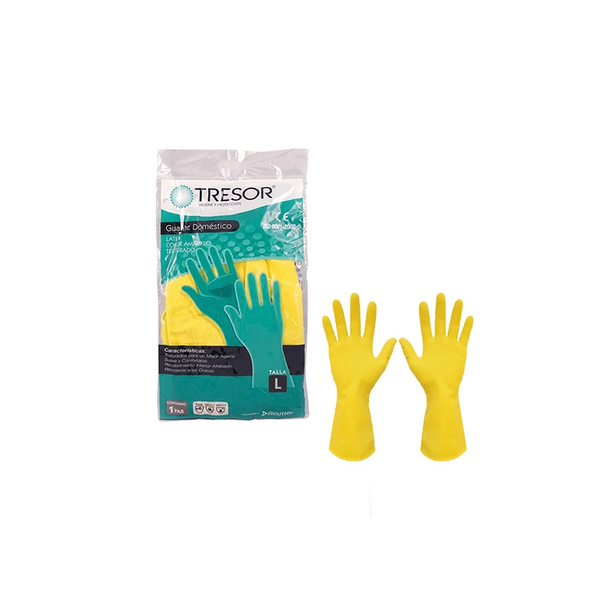 Realiza labores domésticas cómodamente con el Guante Amarillo Tresor, de ajuste amplio. Su material duradero cuida tu piel del contacto directo con productos químicos y suciedad.
