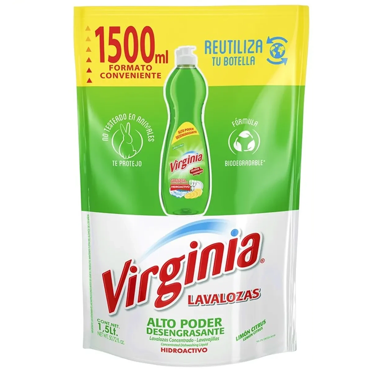 Ahorra y limpia con el Lavalozas Virginia Limón, en un envase recarga extra grande. Su aroma cítrico neutraliza olores mientras su espuma activa deja la vajilla chirriante de limpia.
