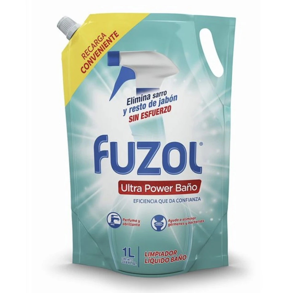 Mantén tu baño impecable con el Limpiador de Baño Fuzol, en un práctico formato de recarga. Elimina el sarro y los restos de jabón eficazmente, devolviendo el brillo a azulejos y griferías.