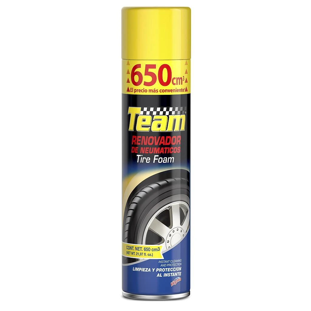 Embellece tu auto con el Renovador de Gomas Virginia Team, en formato aerosol práctico. Limpia, abrillanta y protege las superficies de goma y vinilo contra el agrietamiento.