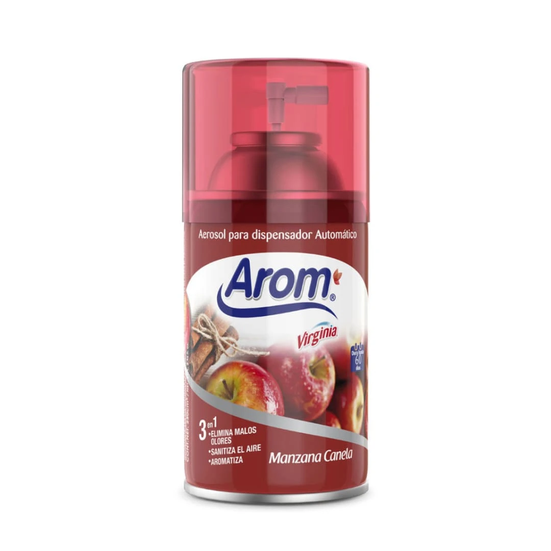 Mantén la continuidad del aroma con el Repuesto Automático Arom Manzana Canela, compatible con dispensadores universales. Virginia ofrece esta fragancia especiada para crear ambientes cálidos constantemente.